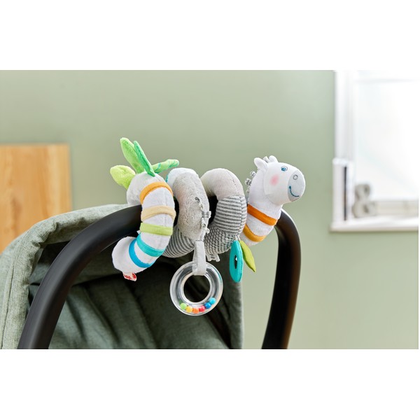 Met deze vrolijke zebra als speelkameraadje vermaakt je kleintje zich altijd onderweg! Deze zachte spiraalmobiel is volledig van stof gemaakt en eenvoudig om een kinderwagenstang of het handvat van een maxi-cosi te bevestigen. Zo kan je baby overal spelen en wordt hij of zij gestimuleerd om te ontdekken. De spiraal bestaat uit verschillende texturen die de zintuigen prikkelen en de fijne motoriek stimuleren. Het speelse ontwerp bevat een zebrafiguurtje met een spiraalvormig lichaam. Zo leert je baby spelenderwijs de wereld kennen en blijft hij of zij onderweg heerlijk bezig!